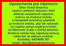 Oznamujeme občanom, že v priebehu dňa 22.10.2020 bude na miestnom cintoríne prebiehať označovanie hrobových miest bez nájomnej zmluvy samolepkami s upozornením. Zároveň žiadame občanov, ktorí doteraz neuzatvorili nájomnú zmluvu na hrobové miesto a nezaplatili príslušný poplatok za hrobové miesto, aby tak vykonali čo najskôr počas úradných hodín na Obecnom úrade v Dolnej Breznici.